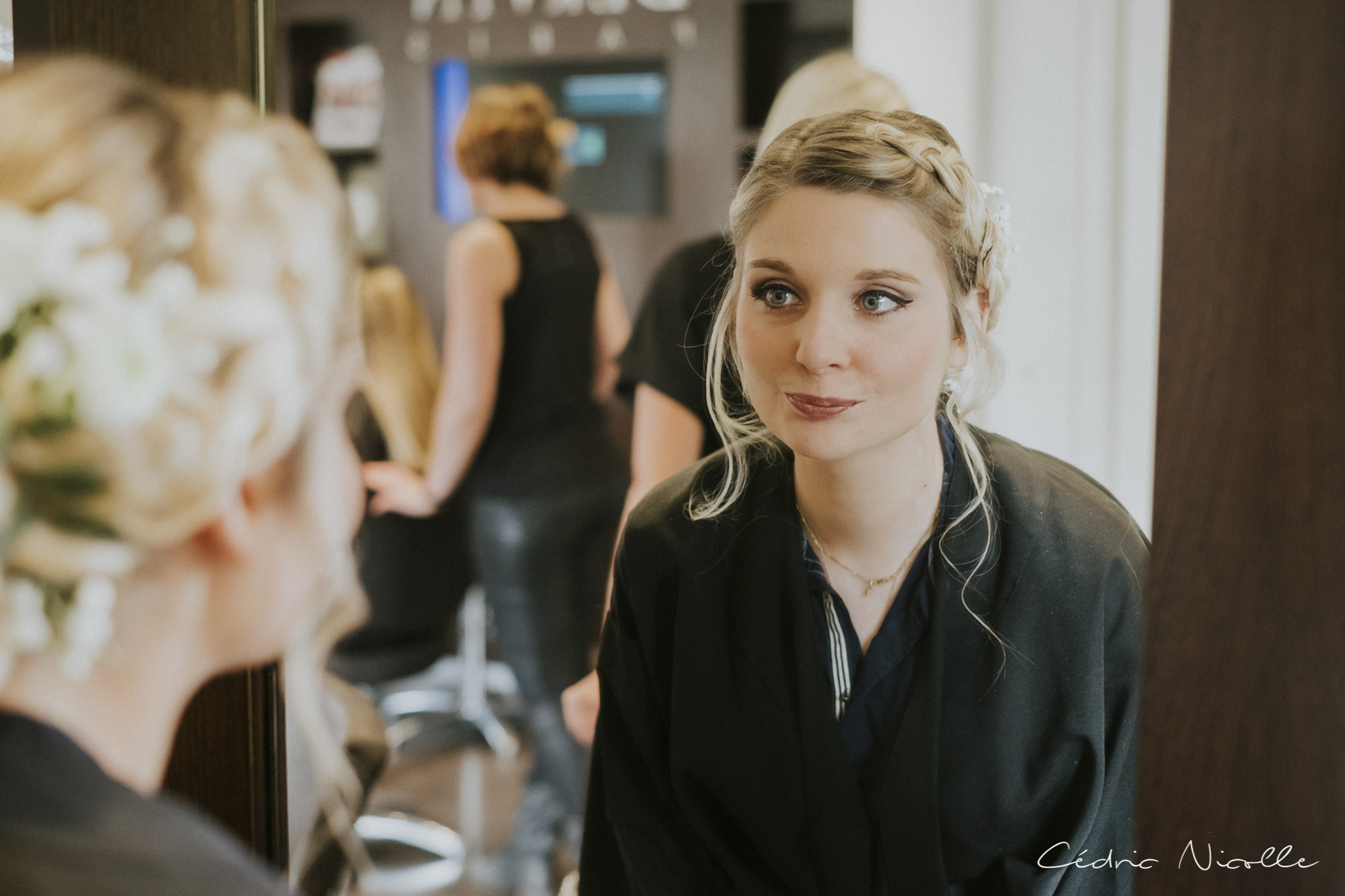 La journée a commencée tôt ! Alice m’a donné rendez-vous chez le coiffeur Michel Dervyn, à Lens, pour sa coiffure et son maquillage en compagnie de sa maman et un de ses frères. Un reportage photo tout en discrétion pour capter les émotions sans déranger ! Le stress était présent chez Alice mais l’ambiance conviviale a fini par la détendre !